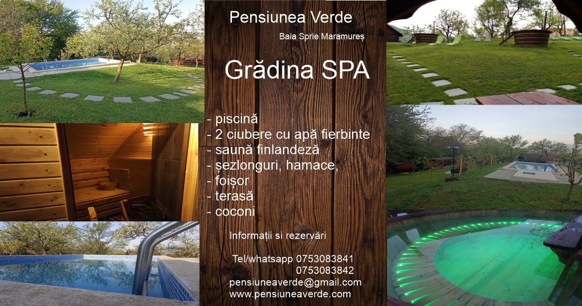 Grădina SPA este un loc liniștit care te încarcă cu energie pozitivă iar elementele SPA din dotarea ei,piscina, sauna și ciuberele cu apă fierbinte în combinație cu verdeața din grădină oferă o experiență unică și de neuitat. Grădina SPA este o zonă de relaxare din cadrul pensiunii noastre dotată cu elemente SPA. În grădină există și o căsuță de lemn dotată cu saună finlandeză, duș cu apă caldă, toaletă și un mic spațiu de odihnă. Grădina mai are în dotare 1 piscina , 2 ciubere de lemnîn aer liber a câte 8 persoane fiecare si un ciubar de 4-6 persoane din fibra de sticla cu hidromasaj.
